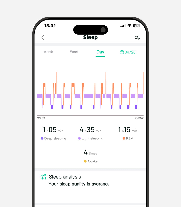 Sleep Tracking: Analyzes sleep patterns by measuring heart rate, body temperature, and movement. It provides detailed metrics like total sleep time, sleep stages (light, deep, REM), and sleep efficiency, helping users optimize rest.