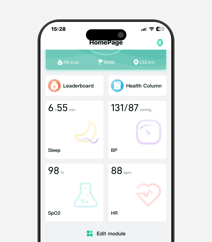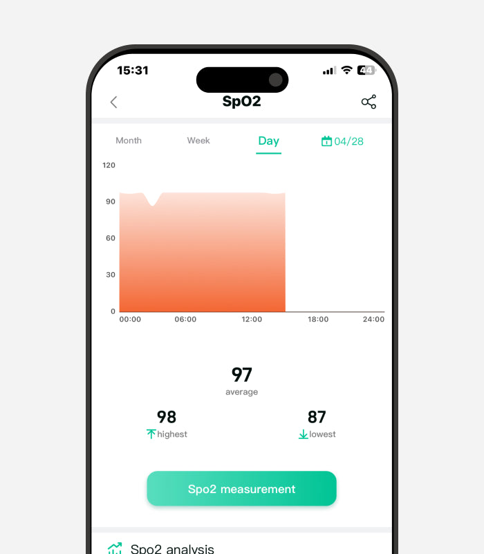 The sensor in the Rune allows you to take on‑demand readings of your blood oxygen as well as background readings, day and night.